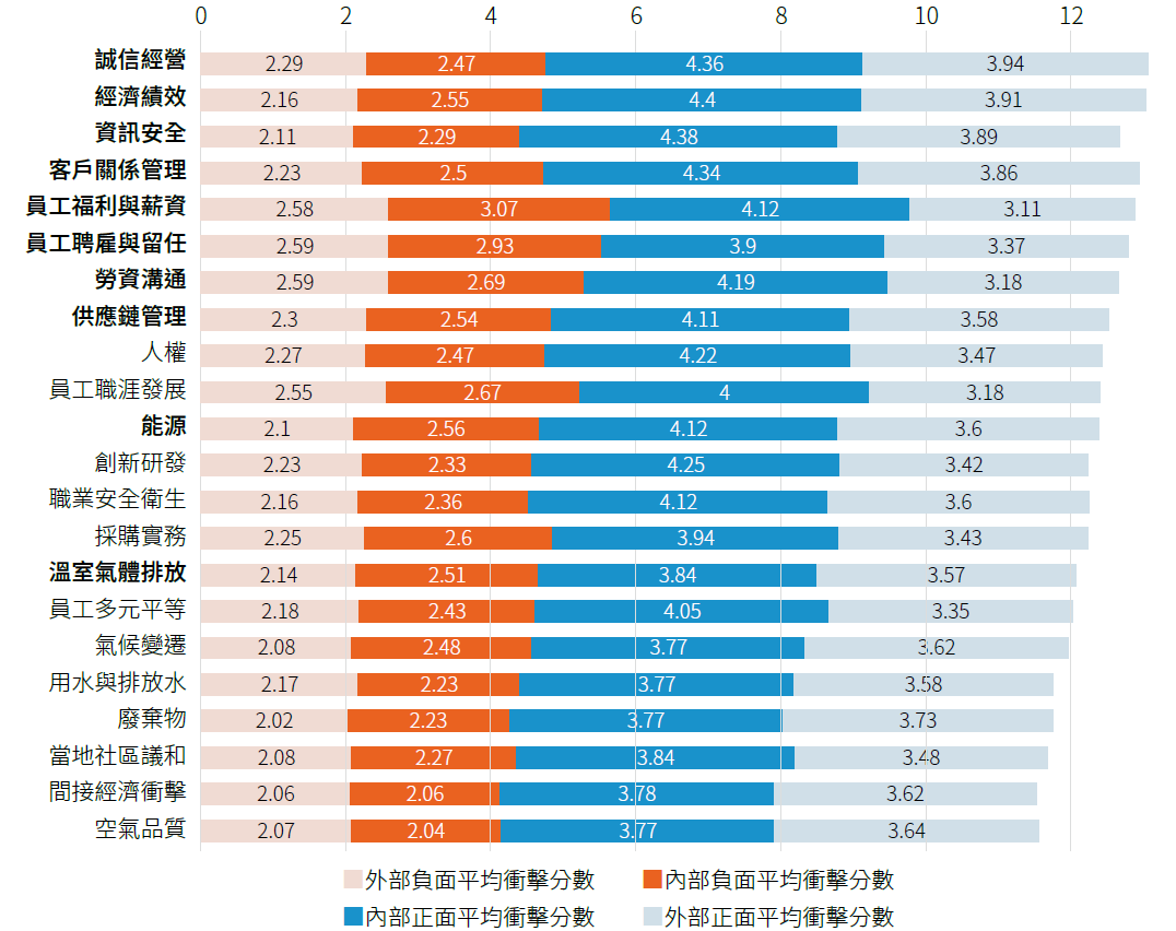 2024年度共計回收695份問卷,排除無效問卷後,有效問卷達540份,內外部分別為58份與482份。計算出各議題對於公司內部及外部利害關係人的正負面衝擊分數後,我們按照各議題衝擊總分由大至小排序,由永續發展委員會設定以「總分前三分之一」作為重大性門檻,篩選出本期8項重大議題。另考量能源與溫室氣體排放亦為本集團及半導體業應加強重視的議題,故將此二項議題納入重大議題管理,2024年度最終共計為10項重大議題。